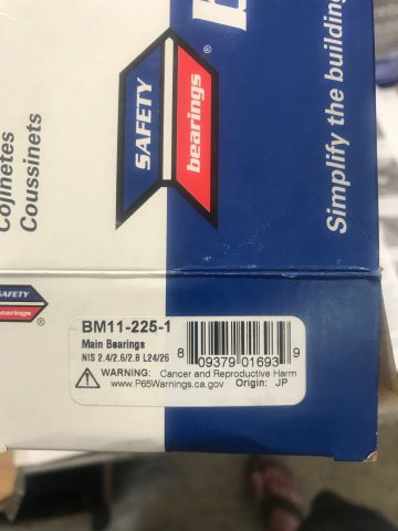 I'm re-assembling the L24 out of my Series 1 240Z and just tried dropping the crankshaft in. It dropped in with a tiny bit more encouragement than I expected, but that center bearing was so tight that I couldn't turn the crank once it was in. I pulled the crank back out to investigate, and that bearing came with it! It was on so tight that I had to lightly hammer it off with the butt of my mallet to get it back off. I assumed that the bearing would have just slipped onto the journal rather than needing to be forced like that. My crankshaft was ground down by 0.25mm, but I can't imagine why that would make the thrust surfaces tighter. I measured the center bearing width and it came out to 32.12mm, but I have no idea if that's nominal or not. I couldn't get a good read on the crank width at the center journal with my calipers. This is my first time building an engine, so any advice is appreciated. Is this kind of interference fit expected here, or should I send my crank back to the machine shop, or just order new bearings? Thanks! See pictures below. The box that my bearings came in. These were provided by my machine shop. Caliper reading on the width of bearing. Notice that the back of the bearing is now scuffed up. When I tried turning the crank one way, the bearing tab prevented it from rotating. When I tried to turn it the other way, the bearing just rotated with the crank and scuffed a little material off its back as it went.