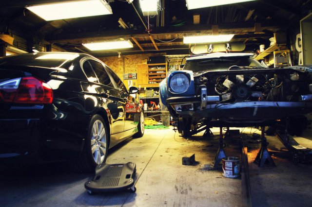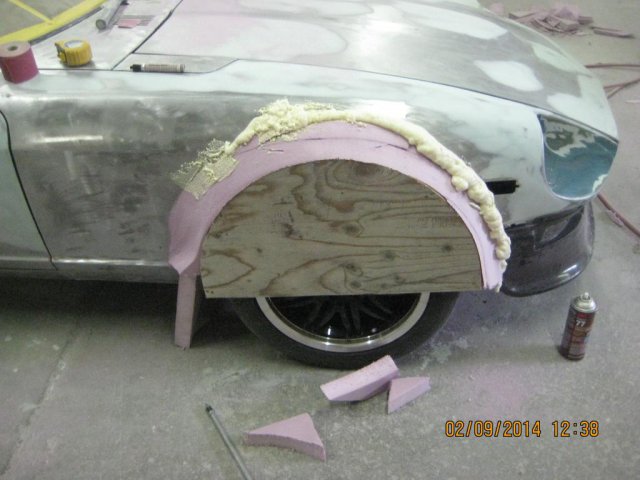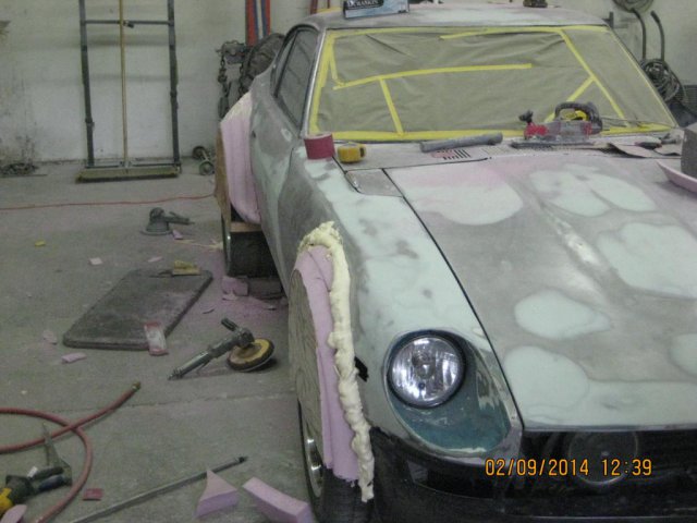 I have a 72 240Z with 6 liter LS2 and T56 6 speed. After the engine/trans install (by Dave - (Viperredls1z), we did a 4 wheel Willwood disc brake setup from Arizona Z Car and while I was doing that, I opted for the package with 5 x 4.5" lugs which gave me the option for larger tires and wheels. I got a set of wheels (11x17 rear and 9x17 front) and mounted Michelin 335/35-17 rears and 275/40-17 fronts. The car originally had hand built flares, but they were poorly done and in any case did not cover the larger tires. This gave me the perfect opportunity to do some paint and bodywork that I have been putting off. The car is in Ralph Garza's Body shop in Roseburg, Oregon for complete body work and paint. Check my facebook page: Datsun V8Z. The old paint is almost all gone,body panels are being aligned and this weekend they started on the flares. I made templates out of 1/2 inch plywood that would be the outside opening of the flares. The template radius is 1 1/2 inches larger than the tire radius. I located the center of the template 1" above the center of the wheels/tires, allowing for a bit more suspension travel. This weekend, Ralph and his buddy John from Portland (who has done SEMA class winners) started mocking up the flares. They are using rigid styrofoam blocks and spray foam to construct a workable surface, then filing and sanding down to a final shape. Hopefully this will be done this weekend, and the fiberglassing can begin. The side marker lights go away, and I'm adding turn signals behind the front grill (yet to be fabricated). No front bumper. Thin black fiberglass bumper? in the rear. It will be painted with many layers of Kandy Tangerine over gold metalflake with a black stripe down the center. This is my preferred daily driver, so we are adding some comfort touches: Lots of sound insulation, Honda S2000 power mirrors, leather reupholstery on the existing 350Z power/heated seats. Also adding a small overhead console for rear-view camera. I've attached a photo of the car before bodywork and a few pictures of it as it sits in the shop. I'll try to post every few days to keep everyone updated.