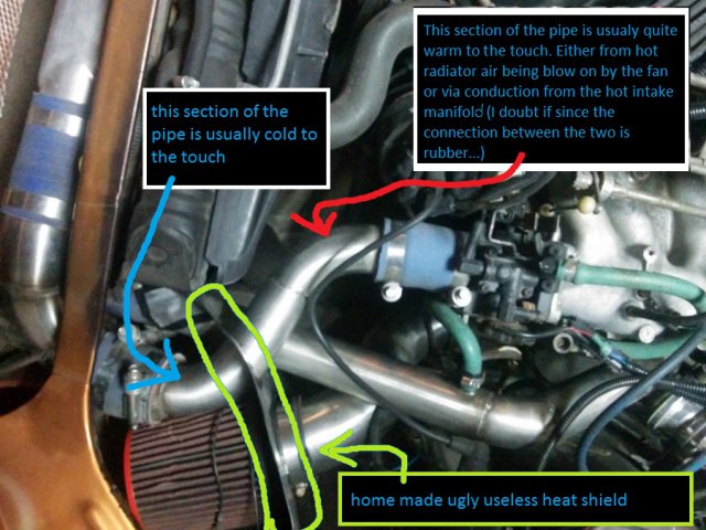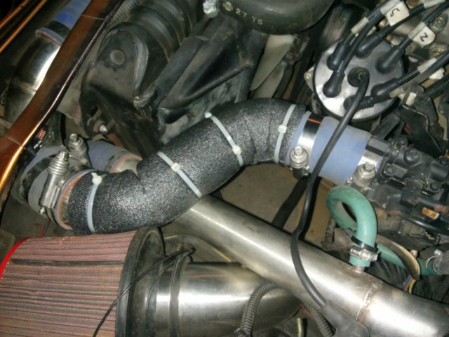 Hi guys. as some of you guys might have seen from another topic I started (http://forums.hybridz.org/topic/122459-air-intake-temperature-soar-when-i-step-off-the-gas/), I've been giving some thoughts to the air intake temperature. Afer poking around the engine while it was still warm, I realized that all the metal air pipes (duh, yeah i know, but it's important for heat conduction) were exposed to the warm engine bay air, and to the engine's radiating heat, and that the radiator's fan blew hot air pretty much directly on them. Touching all these nice pipes, I realized that the pipe from the turbo to the intercooler pretty much too hot to touch (duh again, I'd read about the heat coming from compressing the air but you don't realize how hot till you experience it). I also realized that the pipe from the intercooler to the throttle body started off cool and ended up very warm (can touch for a few seconds) close to the TB. The transition was quite sharp where I've placed a heat shield (sheet metal cut to fit around the pipes to try to limit the filter breathing in air from the engine bay - it didn't make much of a difference for the air temp there). I don't know if the heat shield is helping or it's just because the hot air blown by the fan hits the pipe from there on... I started looking around on the net, and some people had also thought of insulating this particular pipe. There is some debate as to the usefulness of doing this, and none of the sites were particularly methodical with the data taking, so i figured I'd try it, and gather before and after data too. Here is a series of pictures as to what I did to insulate the pipe (after gathering data; more on this later) this is the piping system, as I got the car (plus the heat shield I made) This is the insulation I've used. It's a foam tube to insulate house piping bought at a hardware store for 5$ for 6 feet, 2inch diameter. as you can see, I cut triangles out so I'd be able to bend it to follow the pipe. I eyeballed the cuts, and had to make the triangles wider only once to be able to follow the curve of the pipe this is the other side, since the pipe is s-shaped. with the foam almost all on the pipe to illustrate the use of the cuts With it all in place. tie wrapped on, ghetto style with ugly, white, break-if-you-look-at-them-too-long tie-wraps I had around The final product, with the heat shield seen from a different angle. I know there are gaps in the insulation, but i figure this can be a prototype and i can make it better if it turns out to be useful.... I'll try to post tomorrow on the data I've gathered about the intake temperature before the insulation mod; the file is on my work computer. I've gathered a bunch of info on how fast the temperature goes up once I'm parked iddling after the drive to work. I've got graphs and all, easy to read. post insulation data will be another week or so, I'm guessing, since I don't drive it to work every day (t-tops were leaky, and I've recently cut out part of the floor to fix rust, so no driving when it's wet) I'm also planning on changing the air filter location and making a cold air scoop under the radiator mount, so that and other data will be useful on that too. Stay tuned for other topics I'll start when I gather the supplies I need, the main supply I lack being time)... Comments and suggestions welcomed, follow this post if you're curious to see how it turned out. ******************************see posts 2 and 5 for info, and post 15 for a pre-emptive conclusion********************************