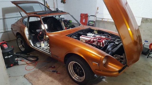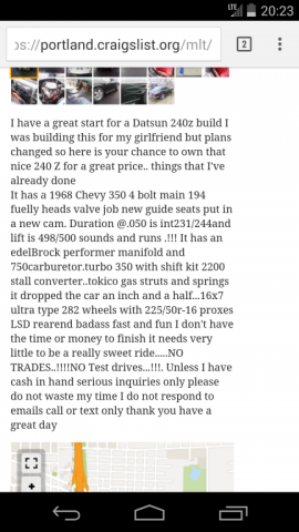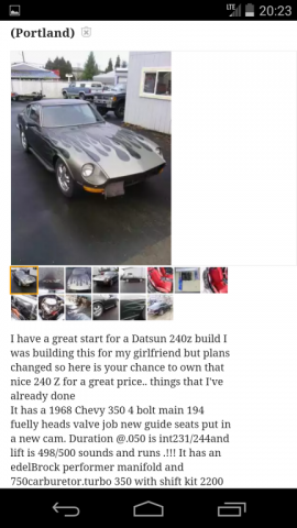 About me I don't want to go too in depth and bore anyone, so feel free to skip. lol My name is Kyle. I'm from Oregon City, Oregon. I'm in the USAF so that's why I am in CA. My current car is a 2008 Honda Accord V6 Manual 6 speed. It's a fantastic and very reliable car. Nice interior and sleek looking exterior. Just a good all around daily. And its the first car I have driven with a stick, and boy did I love it! I have spent a couple years with it, but after increasing its power steadily, I realized the limits and problems with a forward driven car. Not to mention the absolute BS that is California smog. I was at the point of either spend the money on a power adder, or a new car. I decided it wasn't worth pouring more money into a car that had such limitations. Especially in size and weight, she just wasn't very good in the twisties and back roads, so I decided I wanted a Rear driven pre- 1975 car. After a length of time searching, I couldn't believe what an awesome find a 240z was! A small, lightweight, Japanese car, pre- 75, endless parts, huge forum support, the list goes on! I was sold! The Car While on leave back in Oregon for a week, after 3 months of searching for a good deal on a 240z, one popped up for sale for $3,500. Super cheap! It was a 1972 240z with a Chevy small block V8, with a 3 speed automatic. A lot of people had interest, so decided I was done searching, and ready to start building; I bought her outright. Here is the AD: The Good -V8 Swap -The Trunk area, engine bay, and I (hope) under fenders were sprayed with bedliner -Body panels are straight -Badge and side marker light delete -Its a 240z The Bad (As I have quickly, or slowly discovered) -The paint is awful, and needs to be redone (Huge amount peeling) -The windshield wiper doesn't work -The heater doesn't work -The Air Blower doesn't work -The dash was cracked in multiple places -The passenger door was missing the interior panel -The engine, differential, and transmission were pissing oil -The hatch strut was blown -The lights were all extremely dim -The car got less than 8 MPG -Seats are cheap aftermarket ones. Fit nice though actually -You have to SLAM. And I mean SLAM the doors to get them to shut. I'm scared I'll shatter the glass! -The passenger window won't roll down -Probably a lot more I'm forgetting So yes, the car needed work. A lot of it. Was it awesome to drive and own a V8 car? Yes. Yes it was. I only had a few days of leave left, and I sadly realized I couldn't take her with me. Especially with the gas mileage at aircraft carrier fuel consumption rates. On the last night, I took my friend out for a spin, and very soon after leaving the driveway we could smell something burning. It was too foggy to drive fast, so we turned around and went home. I ended up leaving the car at my friends garage, which happens to live only a couple houses down from my dads. Here is the car next to his yellow V6 Mustang: We pulled the windshield wiper motor, the dashboard, the heater blower assembly, cut out random disconnected (and unsafe) wires and taped them up, and cleaned and vacuumed any debris. I loaded the dashboard and wire harness into my car to take back to Cali so I could be somewhat productive for the next 6+ months. Later my friend discovered that the wire harness caught fire in the engine bay! And the harness I had, was melted in multiple places. I decided to scrap it. I will need an entirely new wire harness. What I have been doing Research. Researching like a crazy person. I have also been buying parts like crazy and shipping them to Oregon. Since I'm stuck here, I: -Fixed the Dash Cracks / Sanded / Painted -New Vents -New glove box setup and badge -Autometer gauges -Realized the wire harness I had was hopeless after attempting repair My Friend has been inspecting parts that I send him, and tinkering on the car. -Sold Engine / Tranny / Radiator / exhaust for 750.00 -Sold Bumper -Sold Fuel tank Has a total of 1k. So the car as a roller was 2,500. Even cheaper! What Happens Now I am taking 30 days of leave starting on 20July2016. I plan to: -Sell the Honda -Engine Swap the Z to an LS motor. -Make the 240z my new DD. Here is the car as it is today. My friend installed the $420.00 Fender Mirrors, and there is the photo of the horrible quality Retro-Spec spoiler sitting on the hatch just to see what it looks like: That's it for now. Later I will post shots of my excel sheet of costs, future plans, ect.