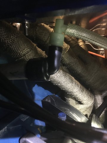 I found this rubber elbow fits nicely. I thought I was being smart, sticking the PCV valve in there but, lol, I realized its not protecting the top vent from backfire. so I got to re think my set up, but the black rubber elbow works as a simple solution for making a connection for the lower fitting. I found it in the "help" section at AUTO-ZONE, It's DORMAN part number 46035. Its actually the second one I have had. The first one developed surface cracks after 3 years. That's to be expected I guess, next next to that header. No big deal, just picked up another one $10. I'll do a full write up on my final setup when I get it finished. Hope this helps someone.