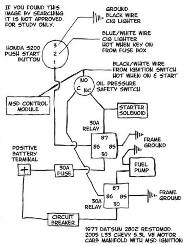 I've been a member here for 13 years and have probably read every post (twice). Now I have a bunch of questions so I tried to wrap them all up into one big question with the use of a wiring diagram. Would someone with good wiring knowledge please look over my drawing and advise me if it’s OK as is or what needs to be changed. Thanks guys! 1977 Datsun 280Z Restomod 2005 L33 Chevy 5.3L V8 Motor Carb Manifold with MSD Ignition