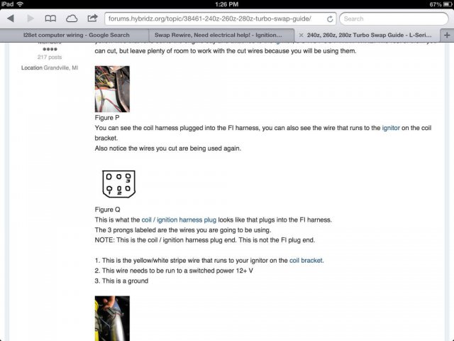 Ok, So I need some help with wiring. I am swaping a 1981 l28et into a 1976 280z I recently just found out that the wiring harness and ECU that I have is from an 1982; after checking the serial # on the computer and noticing that the wiring harness did not have a hook up for the dropping resistors. I have been having difficulty understanding the wiring diagrams for both the 1981/2 harness and the 1976 harness. I have been using the Bumble Z ( wiring torutrial as a reference but I am still confused. Most of what I have figured out is quite simple: the injectors, CAS, other sensors, but thats about it. Problems 1. The Coil and Ignitor This is my original coil. What can I remove from this harness what should I keep? This is my "new" coil I do not have the part of the harness that plugs into it but I have firgured out a way to make a plug for it I just need to know what goes to what. The pins on the ignitor are shaped like a T (a Black w/ whit wire and a Blue wire run to the ignitor from the coil) I cant figure what I should wire to this But I am pretty sure it has to do with the computers spark control. 2. Fuseable Links I have both fuseable links right now for the old engine and the "new" In this picture I have them mounted next to each other. I understand from the Bumble Z tutorial the only wires I need are the green a brown wire on the "new" harness. I am a little uneasy about removing or cutting any of the wires that lead to the existing fusable links. (Do I need this to run my lights or fuel pump?) 3. Ignition Harness This was pluged into what I belive is the ignition harness of the "new" ECU and the back end of this plug should somehow run to the ignitor/coil. In the bumble z tutorial he had a 6 prong plug, his one has 8. 4. Switched Power In the tutorial there are a lot of things that need to be run to switched power what should I use? I think I have firgured out that the black w/ white wire that runs to the coil should be switched power but im not really sure. I will really apreciate some input please dont tell me to search more, maybe at least point me in the right direction. I live in the Seattle area but my car is in lakewood (hour south of seattle). If there are any wiring gurus that can help me I would more than greatfull. Also I am a college student at Seattle University studying photography. i am willing to trade som automotive photography services for help with the wirring. Side Note: I am really losing morale I already have had one of the turbo engines I was working on stolen that I bought for $1000, wich is a lot of money to a college student. Thanks for all the help!!!