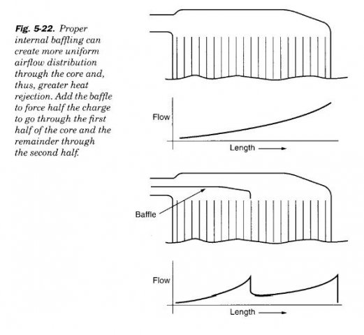 bradyzq Posted December 13, 2009 Share Posted December 13, 2009 Hi All, I know this thread has been dormant for a long time, but what I have to add/ask seems topical, so here goes: Your flow analysis has been from the point of view of the charge air, since all else is external. The charge air sees a cross-sectional area in your case of 18W x 3.5D or 63sq. in.. This number is proportional to the flow rating of the intercooler, all else remaining equal. So, in theory, a 21W x 3D or a 25.2W x 2.5D intercooler core should flow the same as your 18W x 3.5D core. So having a shallower but wider core should not impede flow. But, would it not cool the charge air more effectively? The ambient air that is going through what it sees (in your case) as an 18W x 6H core has the biggest temperature delta (difference between charge and ambient air temps) as it just begins to pass through the 3.5D core. So, it stands to reason that it has the smallest delta temperature just as it exits the core. This means the ambient air cools less and less efficiently as it passes through the core. So, if the above is accurate, wouldn't a shallower core be more efficient than a deeper one? I realize you were just trying to salvage a crappy design, but the thread seems to have gone beyond that, even though it has barely touched upon the cooling abilities of different types/shapes of intercoolers (air-air in this case). If you're interested in doing the simulations, I'd be curious to see whether a 21W x 5.14H x 3D core or a 25.2W x 4.29H x 2.5D core would flow any differently than yours, all else being equal. These all have the same frontal area (108sq. in.) and same end tank x-sectional area (63sq. in.) Or try them with 6H, too? I have zero experience with the type of software you're using, but if you can introduce the cooling effect of the ambient air, it would be very interesting to see which version "wins." Quote Link to comment Share on other sites More sharing options...