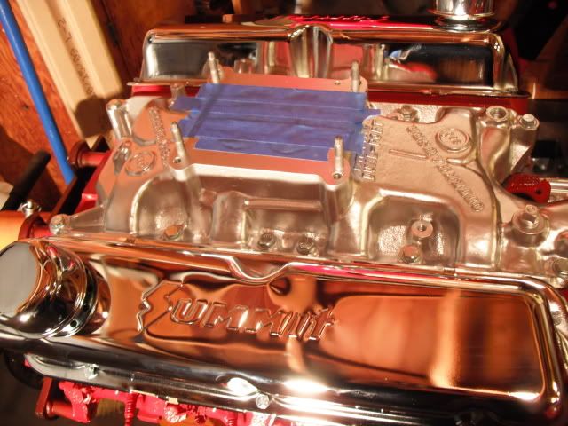 I took my intake and timing cover to the machinist to get cleaned, then painted them with the same paint I used on the transmission. I guess its alright. I am going for a red-white-blue theme with the engine, so being a little more shiny works.